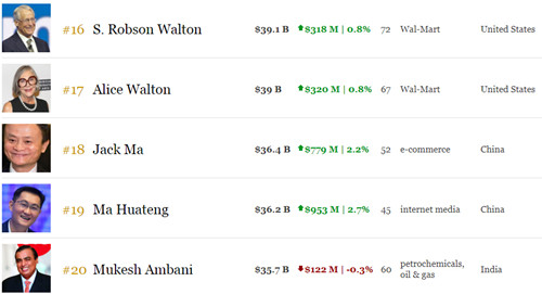 如图所示,福布斯数据显示,马云个人财富达364亿美元,超越马化腾的362亿美元。目前,马云个人财富排名世界第18名,马化腾排名第19。