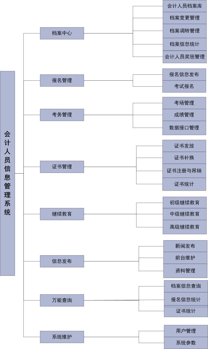 会计人员管理系统主要包括:门户网站、报名管理、档案中心、考务管理、证书管理、继续教育、信息发布、系统维护几大模块。纵向实现了各省份到各市、区、县的会计人员集中式管理,数据统一存储、相互共享、便于数据分析汇总。横向实现了会计人员报名、缴费、考试、成绩查询、证书申请颁发、信息变更、继续教育、奖罚等全过程流程管理。
